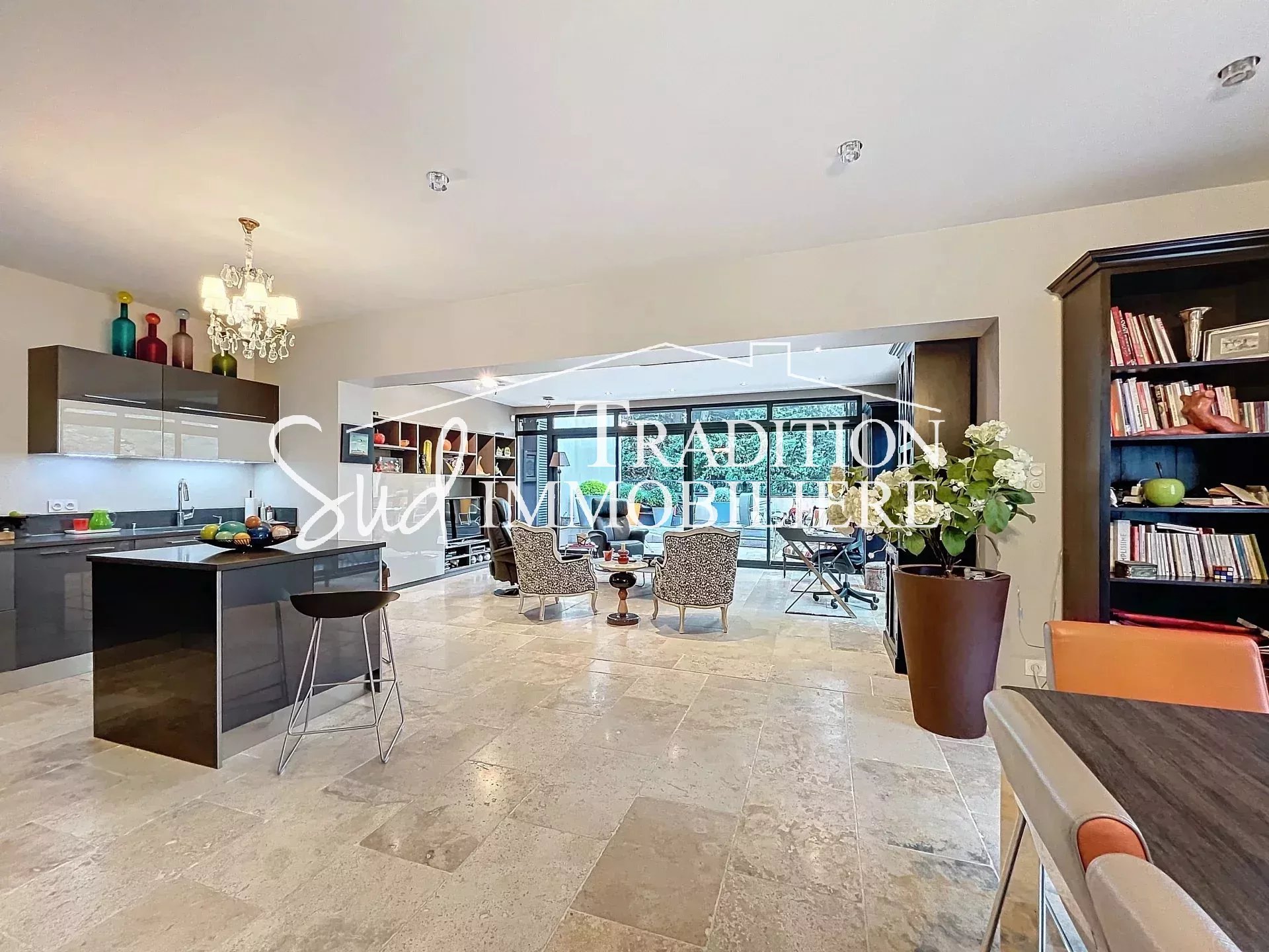 La pièce de vie lumineuse composée d'une cuisine équipée, salle à manger et salon s’ouvre sur une terrasse en bois, sans vis-à-vis, avec jacuzzi et vue dégagée sur les Alpilles.